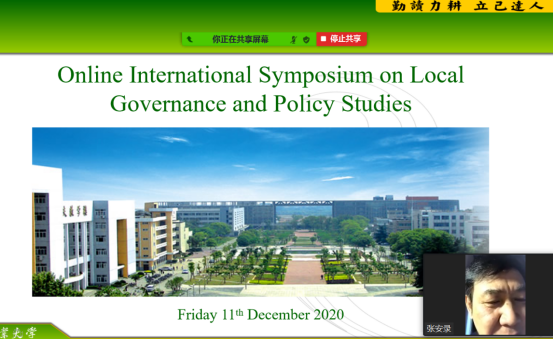 主办的地方政府治理和公共政策研究线上国际研讨会成功举行。本次研讨会邀请了来自美国俄亥俄州立大学、伊利诺伊州立大学、加拿大马尼托巴大学和中国地理科学和自然资源研究所等多所高校、研究机构的学者线上交流分享了相关研究成果,60余名师生参加了研讨会。