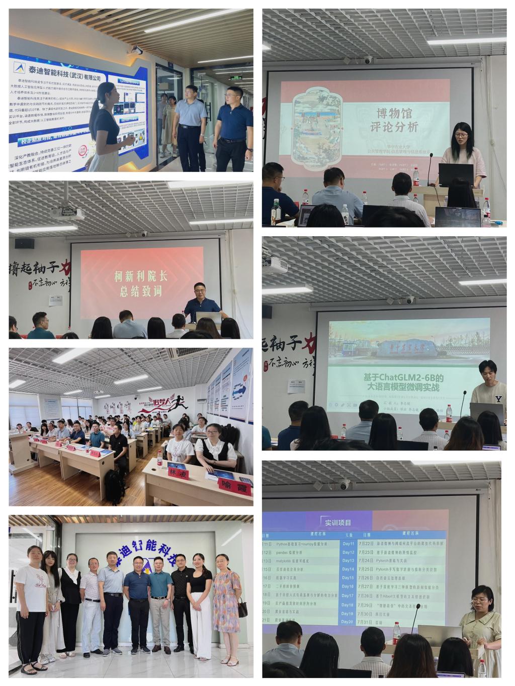 在泰迪智能科技有限公司,公司主讲老师王右雪女士简要介绍了泰迪科技公司的概况以及本次实习的内容安排。柯新利院长一行参加了信管专业学生实习结业汇报活动。李志健同学小组以“大模型微调应用”为主题,介绍了创建个性化AI对话模型“嬛嬛-Chat”,并优化法律文书罪名预测模型“Law-Class”的项目完成情况。孙丽君同学小组分享了聚焦于博物馆评论内容的文本挖掘,利用数据挖掘技术为博物馆用户满意度研究提供支持的项目开展情况。同学们表示,实习经历极大地提升了他们的编程技能、数据处理能力、机器学习与深度学习应用水平,强化了团队协作与解决实际问题的能力,为他们今后的学术深造和职业发展打下了良好的基础。