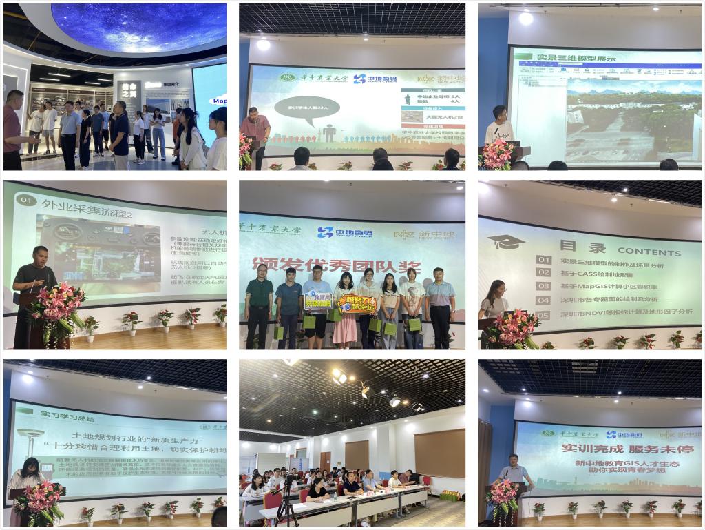 在中地数码集团,副院长院长汪文雄一行参观了中地数码历史文化馆,同学们通过照片和实物了解了中地数码在GIS技术发展方面的历史和成就。22名同学分组进行项目实习项目演示汇报,杨兴权和周青老师进行了详细点评,院企双方导师评选出了优秀项目团队,副院长汪文雄和中地数码集团副总经理陈俊麟一起为优秀团队颁奖。同学们表示,经过一个月的系统培训与实践,他们掌握了无人机飞行操控、外业数据采集、倾斜与正射摄影等前沿技能,还熟练运用Cass、Dp Modeler、MapGIS及QGIS等专业软件进行三维建模与数据分析。中地数码集团高校合作部经理邢影表示,本次实习项目体现了内容创新和成果创新、外业与内业相结合、理论与实践相结合。同学们加深对专业知识的理解和应用,积累宝贵的项目实操经验,从而为日后参与科研工作或职场竞争储备坚实的技能基础。