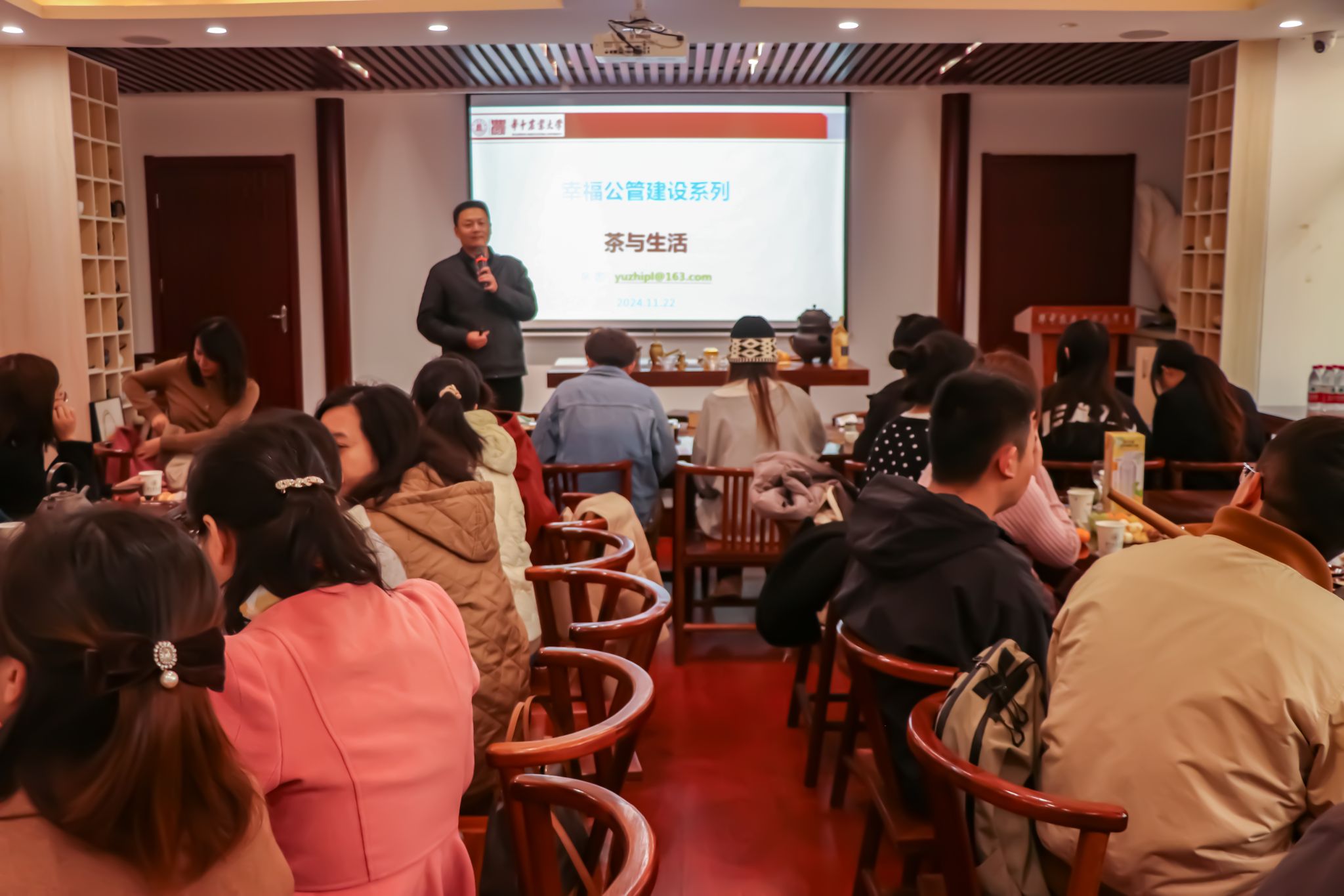 耕读茶室内,古韵悠悠,各式精致茶具错落摆放,各式茗茶静候知音,空气中弥漫着一股淡然而雅致的气息,仿佛时光在此刻凝固。余老师以生动的叙述和详实的史料,从神农尝百草的药用奇缘,到唐宋时期的茶风盛行,再到现代茶文化的复兴与传承,将茶文化的深邃展现得惟妙惟肖。他更将茶文化融入现代生活,细致讲解茶的种类繁多、功效各异及适用情境,讲到了乡村振兴中茶产业的重要作用,使师生对茶学有了更为全面且深刻的认知。