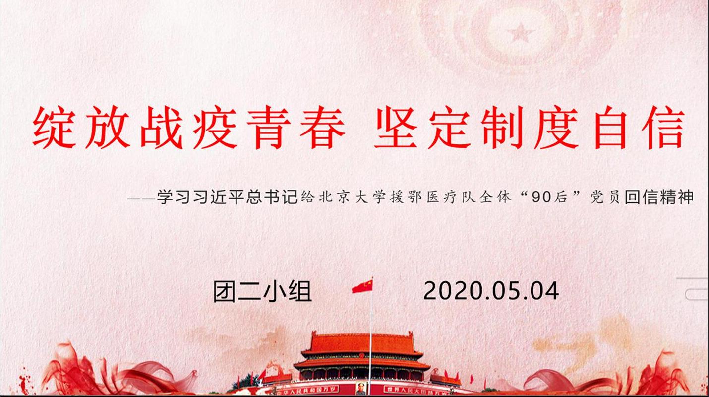 此次主题团日活动包括主题背景概述、回信精神学习、从疫情讲制度自信、疫情和制度自信答题、总结汇报五个主题模块。首先第一位主讲人朱鸿艳同学向大家介绍了此次团日活动的背景概况,会议时间恰逢五四青年节,在这一特殊的时间节点,分享中国青年青春战疫的热血事迹,勉励广大共青团员和青年学子传承发扬五四精神。随后王安琪同学朗读了习近平给北京大学援鄂医疗队全体“90后”党员的回信,班内同学就回信内容抒发感想。李璞同学表示,“看完习主席给这些90后党员们的回信,我回想到,在十年之前,我们十岁左右,他们正值青春,是我们敬重的哥哥姐姐。十年之后,他们身上已不知不觉增添了许多身份,他们变得成熟,成为了保护我们的人。我们看到了他们的理想、本领、担当,他们在奉献自己、实现人生价值的同时又给我们做了中国青年的榜样,鼓励我们像他们一样有热血、有激情,成为国家需要的人!”