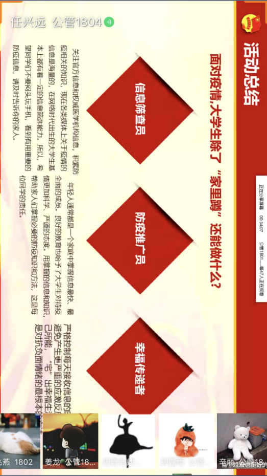 会议伊始,任兴远通过一组全国疫情走势数据来介绍此次新型冠状病毒感染的肺炎疫情的基本情况,说明了武汉市疫情防控形势的严峻性。随后,任兴远带领同学们一同学习了共青团中央发布的《关于坚持党的领导,全团动员、在防控疫情阻击战中充分发挥共青团生力军和突击队作用的通知》等文件精神,全体学生就其中提出的“听从党的号令,坚持全团动员,积极投身阻击疫情的重大政治任务”、“充分发挥广大团员和基层团组织在疫情防控工作中的生力军和突击队作用”、“全力以赴支援疫情防控斗争第一线”、“广泛发动广大青年参与疫情防控阻击战”和“让党的号召、团的动员最广泛地直达青少年”五点指示作了深入的思考和讨论,大家一致表示将贯彻落实共青团中央提出的要求,在照顾好自己和家人身体的同时,主动参与社区(村)组织的抗疫志愿活动。